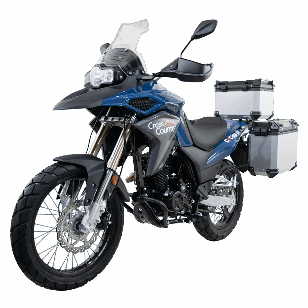 Equipada con un motor monocilíndrico de 4 tiempos enfriado por aire, la CrossCountry ADV 250 ofrece 16 HP de potencia máxima y una transmisión estándar de 6 velocidades, garantizando un manejo equilibrado, eficiente y seguro
